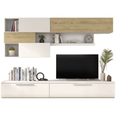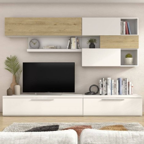 El Mueble de Salón Isona es la combinación perfecta de diseño mediterráneo, funcionalidad y versatilidad. Totalmente reversible, te permite adaptar cada módulo según tu espacio: coloca el conjunto a izquierda o derecha y orienta el módulo superior en vertical u horizontal para crear la composición ideal. Su amplio almacenamiento, con cajones, puertas y estanterías, te ayuda a mantener todo perfectamente organizado sin renunciar al estilo. El acabado en Roble Natural y Blanco aporta una gran sensación de luz y calidez, creando ambientes acogedores y modernos. Diseñado para televisores de hasta 55”, es la solución perfecta para un salón práctico y elegante.